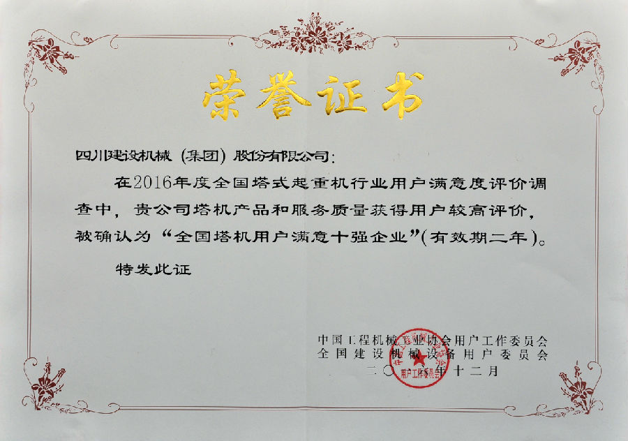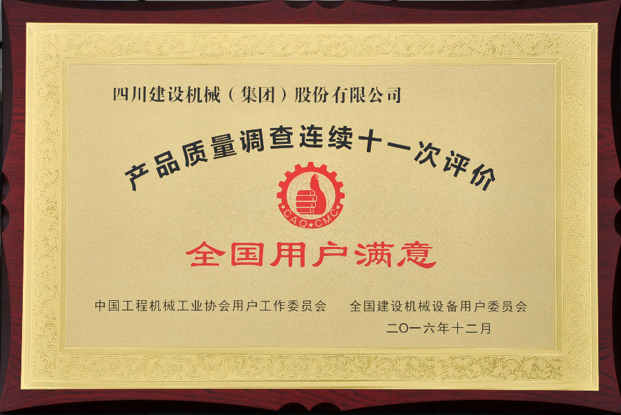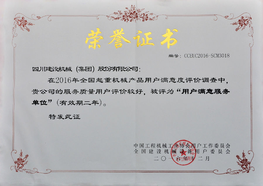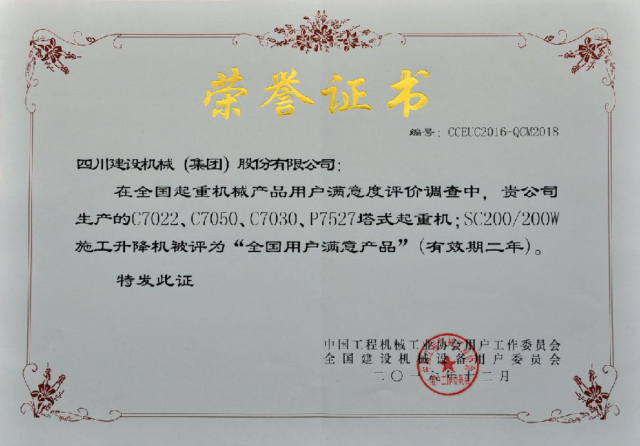2016年全國(guó)用戶(hù)滿(mǎn)意產(chǎn)品評(píng)價(jià)測(cè)評(píng)結(jié)果公布,四川建設(shè)機(jī)械(集團(tuán))股份有限公司憑借良好的產(chǎn)品和服務(wù)質(zhì)量獲得全國(guó)用戶(hù)的較高評(píng)價(jià),榮獲了“全國(guó)塔機(jī)用戶(hù)滿(mǎn)意十強(qiáng)”企業(yè);獲得產(chǎn)品質(zhì)量調(diào)查連續(xù)十一次評(píng)價(jià)“全國(guó)用戶(hù)滿(mǎn)意”企業(yè);公司生產(chǎn)的C7022、C7050、C7030、P7527塔式起重機(jī)以及SC200/200W施工升降機(jī)被評(píng)為“全國(guó)用戶(hù)滿(mǎn)意產(chǎn)品”;同時(shí)獲得“用戶(hù)滿(mǎn)意服務(wù)”獎(jiǎng);1989年至今川建已連續(xù)十一次獲得全國(guó)用戶(hù)滿(mǎn)意獎(jiǎng),得到了業(yè)內(nèi)用戶(hù)的高度認(rèn)可。