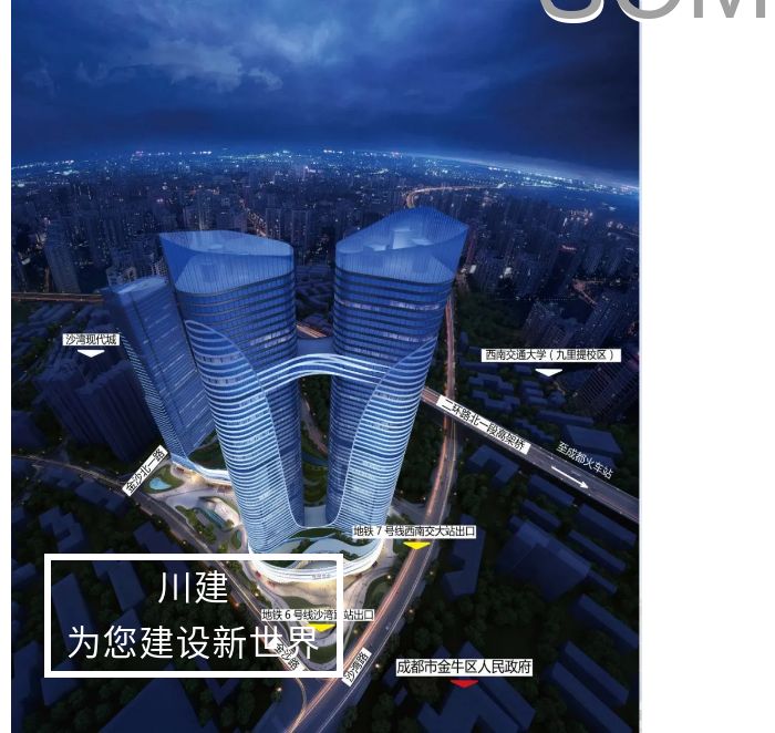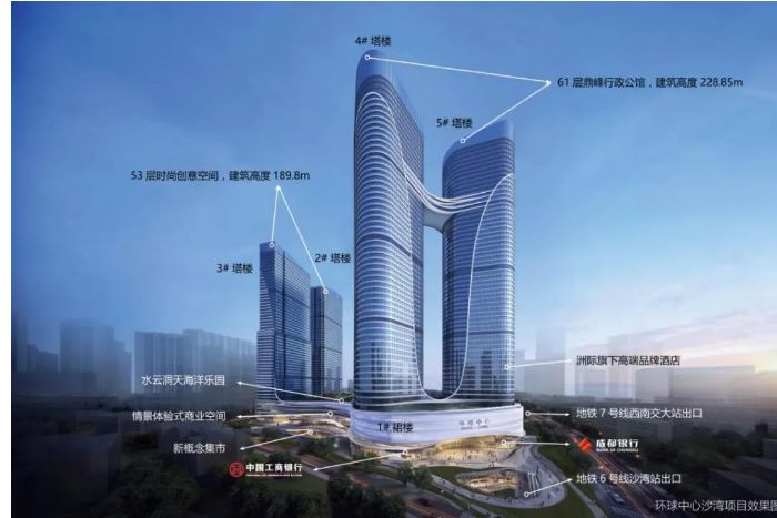 項目由3層商業(yè)裙樓(局部4層)及4棟超高層塔樓組成,最高塔樓高達(dá)243米,被譽(yù)為“摩天雙子塔,標(biāo)定時代天際線”、“新世紀(jì)·成都高端峰寓范本,當(dāng)代高階天幕藝術(shù)品,全球一線臻裝選材”,是成都市西北新地標(biāo)建筑。