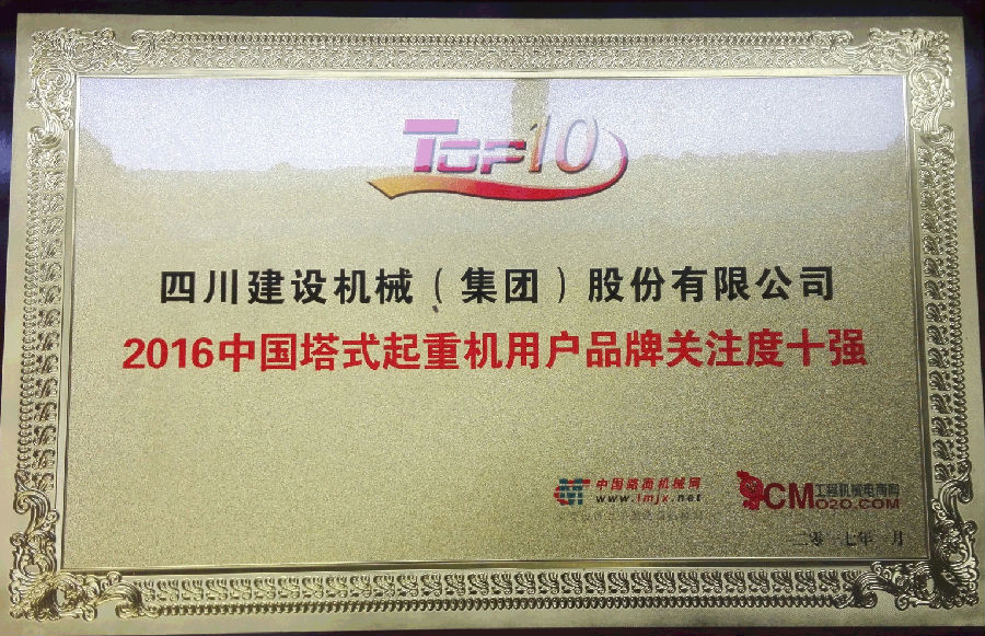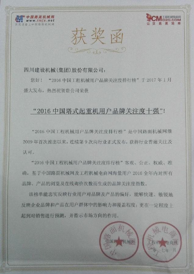 2017年1月3日,中國路面機(jī)械網(wǎng)和工程機(jī)械電商網(wǎng)在北京發(fā)布“2016中國塔式起重機(jī)用戶關(guān)注度排行榜”,四川建設(shè)機(jī)械(集團(tuán))股份有限公司進(jìn)入“2016中國塔式起重機(jī)用戶品牌關(guān)注度排行榜”前十強(qiáng),排名第二位。