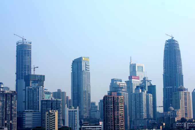 左邊高的是重慶賓館的C7022,封頂高度為290米,右邊高的是環(huán)球金融中心FO/23C,高度是260米,均為內爬型式